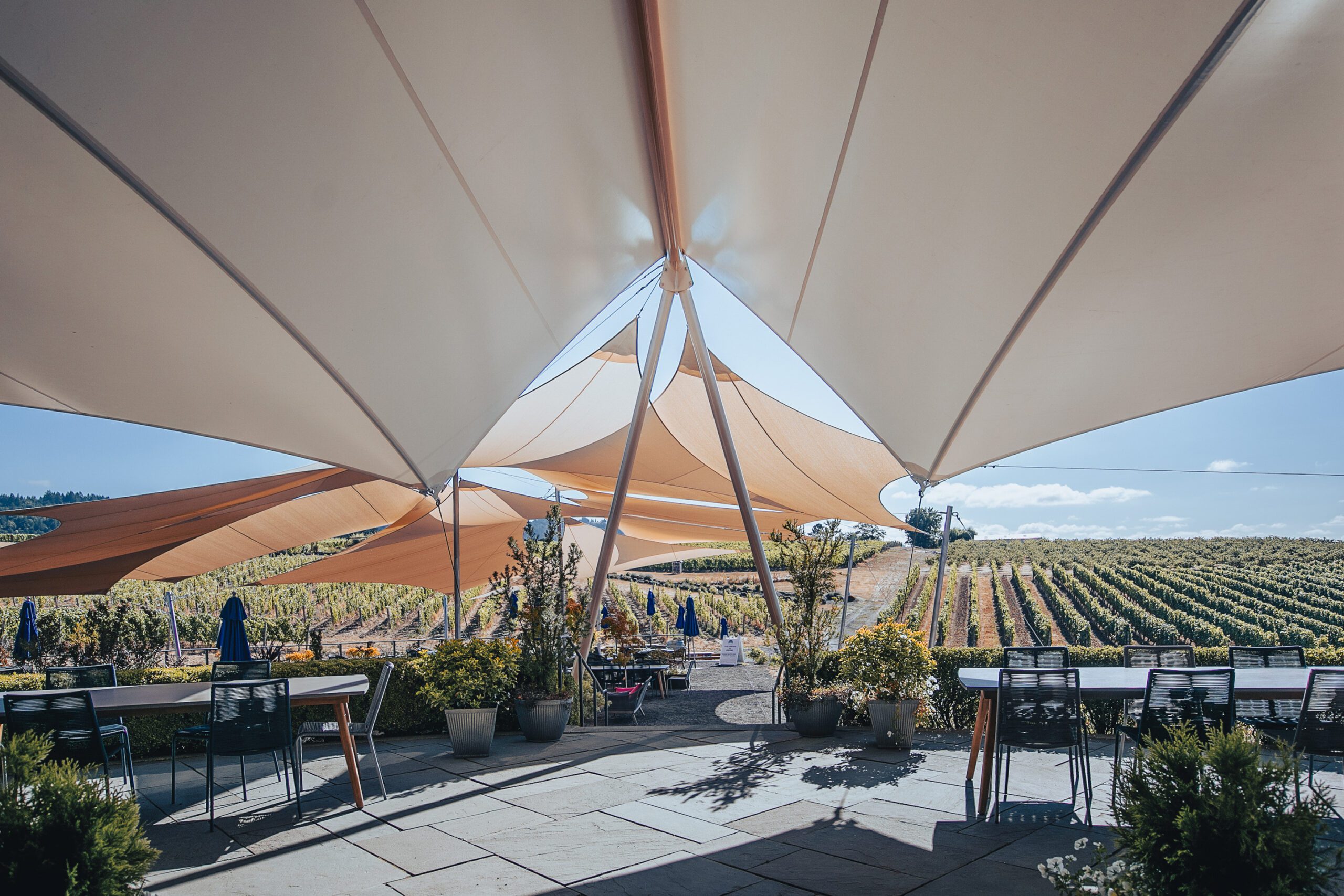 Adelsheim Vineyard sought to extend its outdoor tasting room’s capacity and provide year-round protection from the elements. The solution was a multi-layered canopy system, featuring a permanent shade structure over the upper patio and a seasonal sail structure for the lower patio. The use of GALE Pacific’s Commercial NinetyFive fabric enabled the creation of a flexible, elegant design that blends modern functionality with classic architecture. This project not only extends the winery’s season but also offers guests comfortable seating areas, rain or shine.