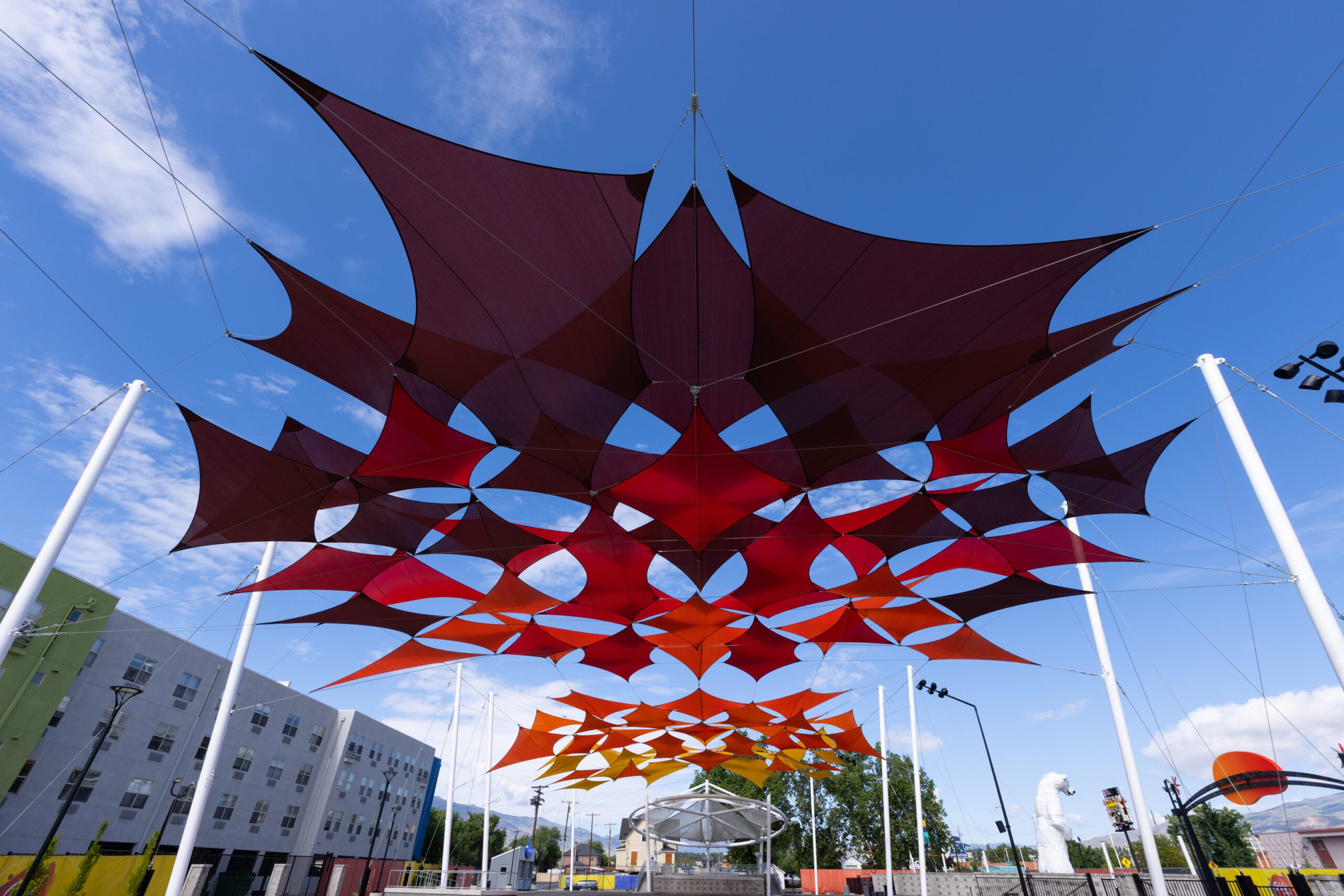 Located in the heart of Reno’s vibrant festival district, Glow Plaza needed shade relief from Nevada’s hot summer sun. The installation of GALE Pacific’s Commercial NinetyFive fabric provided shade to 70% of the plaza while simultaneously adding a dramatic, sculptural element to the space. The colorful, artistic design makes the plaza more visually engaging while offering much-needed rest from the heat, turning it into a comfortable gathering spot for visitors.
