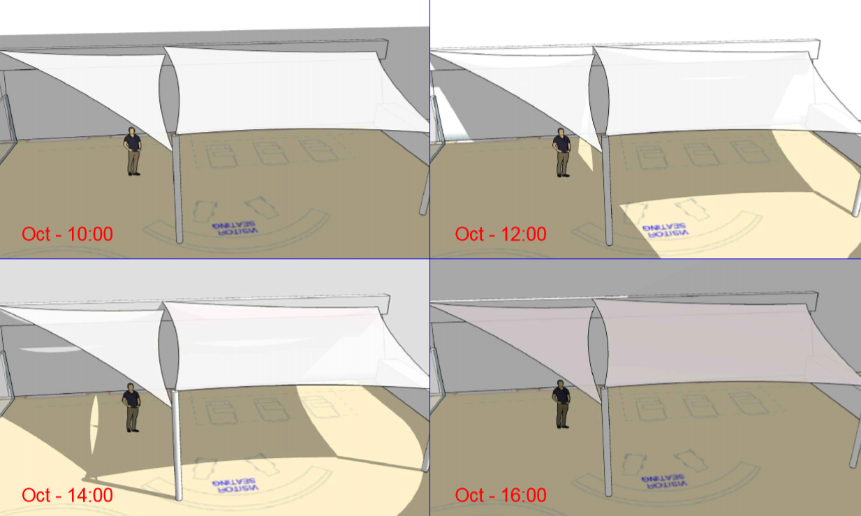 Early analysis of the space allowed us to design and deliver a solution optimised for performance in all conditions, around-the-clock. This example showcases a study in sunlight angles to determine effective shade coverage throughout the day.
